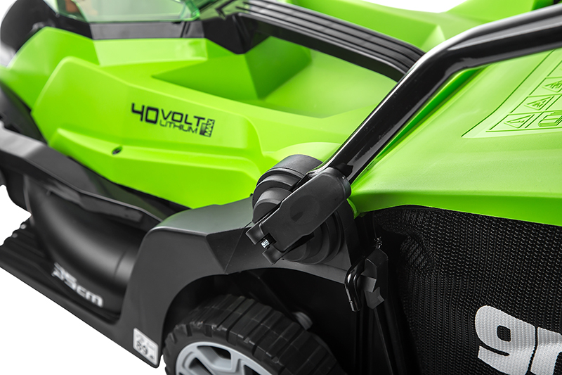 Аккумуляторная газонокосилка GreenWorks G40LM35. Это полупрофессиональная модель для стрижки газонов в домашних хозяйствах. Газонокосилка оборудована системой защиты двигателя от механических повреждений камнями и т.д Данная модель оснащена травосборником и обладает функцией мульчирования. Травосборник служит для сбора скошенной травы. Таким образом предотвращается выгрузка на газон, который вы скашиваете. Мульчирующая заглушка закрывающая заднее разгрузочное отверстие, позволяет ножу косилки измельчать срезанную траву. Удобный 5-ступенчатый рычаг обеспечивает регулировку высоты скашивания от 32 мм до 85 мм. Удобная рукоятка. 15 см передние, 18 см задние колёса позволят комфортно управлять газонокосилкой. Рама газонокосилки имеет складную конструкцию, для удобства транспортировки и хранения. Эта модель моментально готова к работе нажатием одной кнопки. Благодаря питанию от 40V аккумулятора газонокосилка обеспечивает долгую автономную работу. Данный аккумулятор совместим с другими устройствами из линейки G-MAX 40V. Для безопасной работы газонокосилка оснащена ключом безопасности.