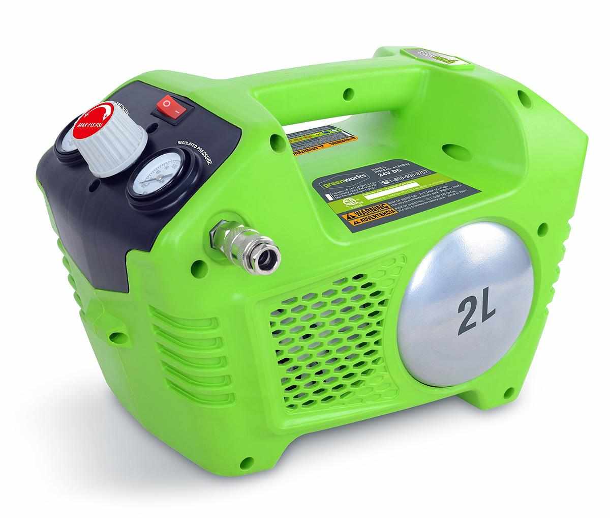 Аккумуляторный воздушный компрессор GreenWorks G24AC. Оснащён ручкой регулятора давления для регулировки количества воздуха, поступающего через шланг. Безмасленный насос снижает потребность в техническом обслуживании. Воздушный компрессор оснащен быстроразъемным соединением, расположенным на боковой стороне устройства. Имеет 2л воздушный резервуар и 2 манометра (регулировочный манометр давления и манометр давления в резервуаре). На регулировочном манометре давления отображается текущее давление в трубопроводе. Это давление можно регулировать вращением ручки регулятора давления. Манометр давления в резервуаре показывает давление воздуха в резервуаре. Оборудован сливным и предохранительным клапанами. Сливной клапан на резервуаре предназначен для слива конденсата, что позволяет предотвратить коррозию резервуара. Предохранительный клапан предназначен для автоматического выпуска воздуха, если давление в воздушном резервуаре превышает заданное максимальное значение. Удобная ручка для переноски. Воздушный компрессор был разработан таким образом, чтобы надежно стоять в горизонтальном или вертикальном положении. Эта модель моментально готова к работе нажатием одной кнопки. Благодаря питанию от 24V аккумулятора компрессор обеспечивает долгую автономную работу. Данный аккумулятор совместим с другими устройствами из линейки G-24.