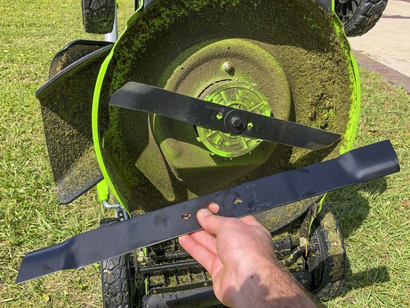 Если вам не нужен полный час работы, рассмотрите возможность замены стандартного отвала на отвал с большой подъемной силой, который входит в комплект поставки Greenworks. Вы потеряете некоторое время работы, но приобретете более эффективную упаковку и мульчирование. Для большинства газонов площадью 1/4 акра или меньше мы рекомендуем сделать этот переключатель. Вам не понадобятся дополнительные батареи, чтобы закончить газон на одном комплекте.