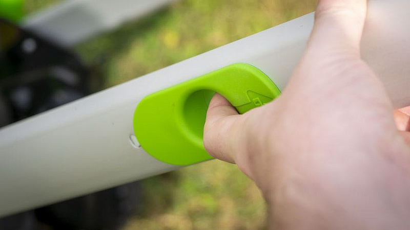 Старая версия этой косилки отлично подходила для вертикального хранения. В новой газонокосилке 60 В эта функция значительно улучшена за счет изменения механизма рукоятки. Вместо того, чтобы наклоняться к основанию газонокосилки, чтобы освободить или отрегулировать ручку, Greenworks теперь имеет две защелки в верхней части боковых планок. Просто потяните защелки вверх с помощью упоров для пальцев, переместите ручку в нужное место и отпустите. Ручка фиксируется на месте. Тот же механизм позволяет полностью сложить его для хранения.